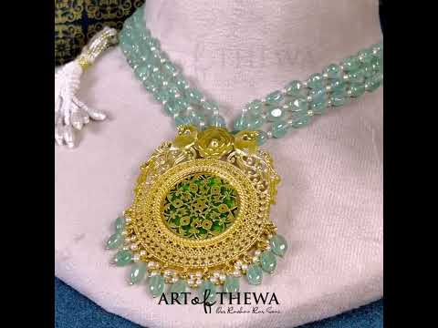 This stunning piece is designed by Raghav Rajsoni who is the 6th generation artisan of the Rajsoni family who invented Thewa art crafts. This piece is inspired to bring the taste of new generation in Art of Thewa as this was a idea of Padmashri Mahesh rajsoni famous Thewa artist, this set is a blend of 23 kt gold work on Belgium glass, with contemporary style, perfect for adding a touch of freshness to your ethnic, casual look.