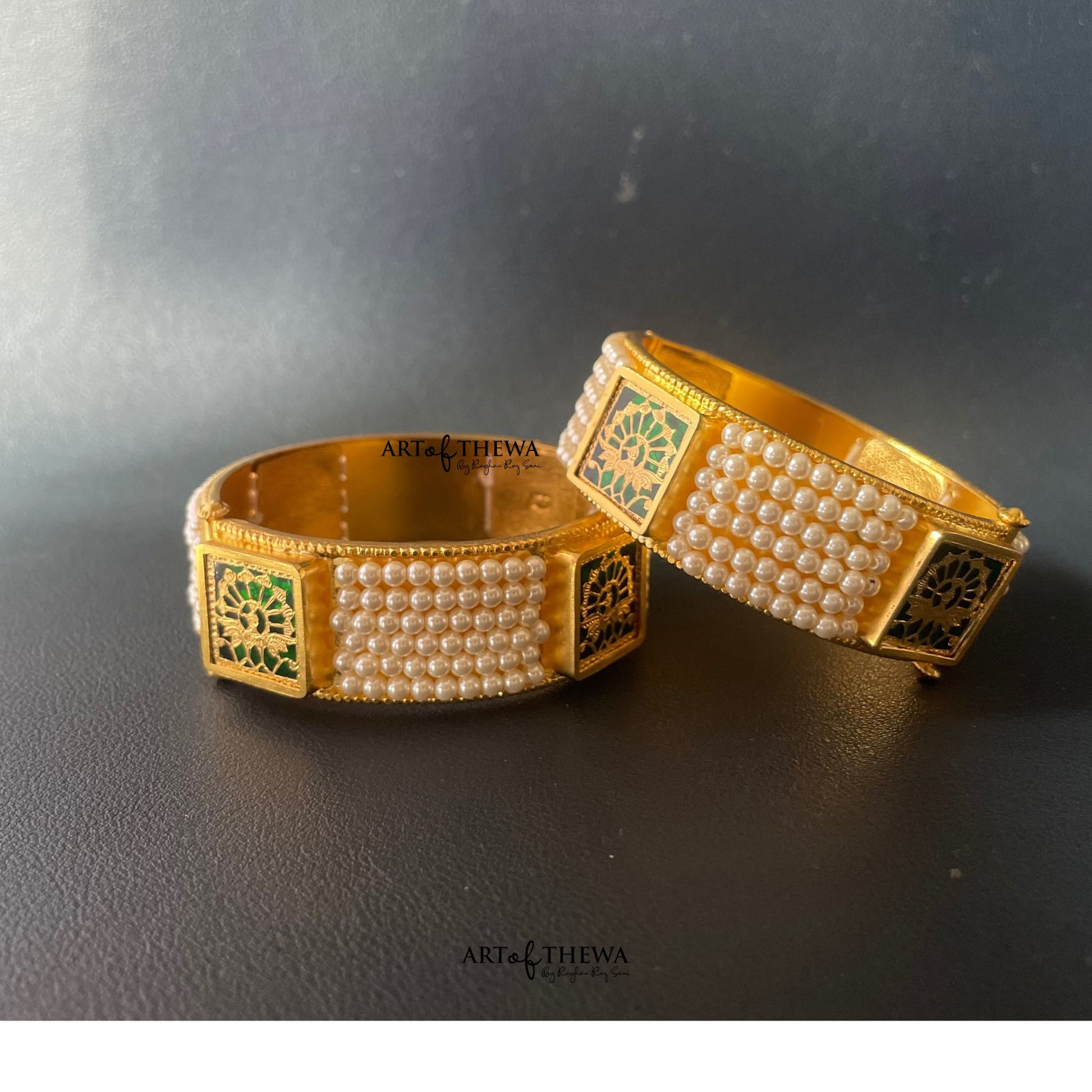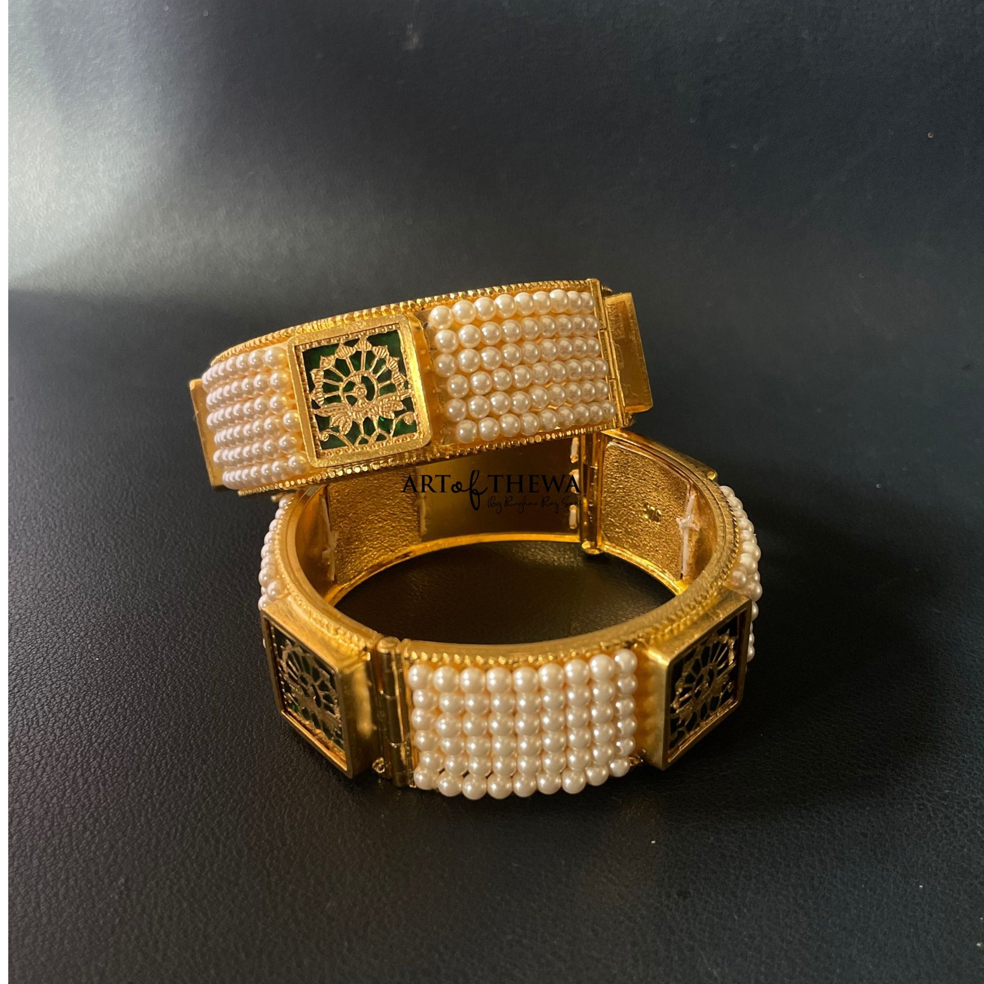 Presenting gold work on glass crafted Thewa art Pearl bangle with this 4 -piece Thewa Piece Bangle set, crafted by Raghav Rajsoni, 6th generation Artist in Rajsoni Family of Thewa art.