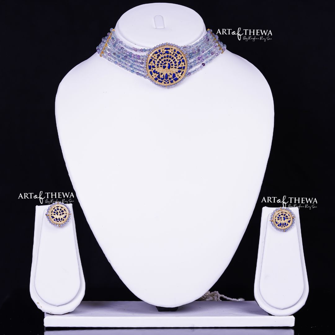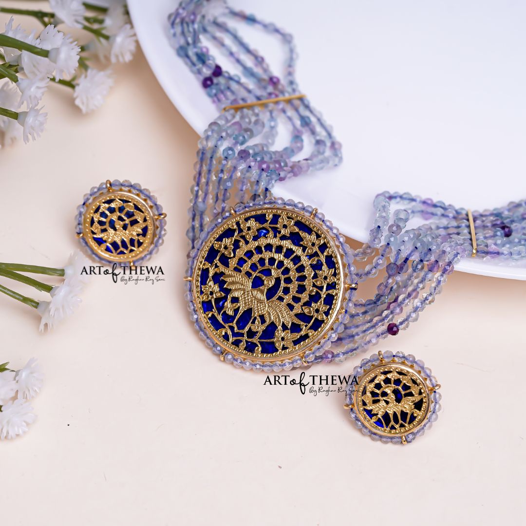 Step into a world of enchantment with our captivating "Dancing Peafowl Set," featuring colorful Stones and a pendant adorned with an intricate thewa Dancing peacock design.