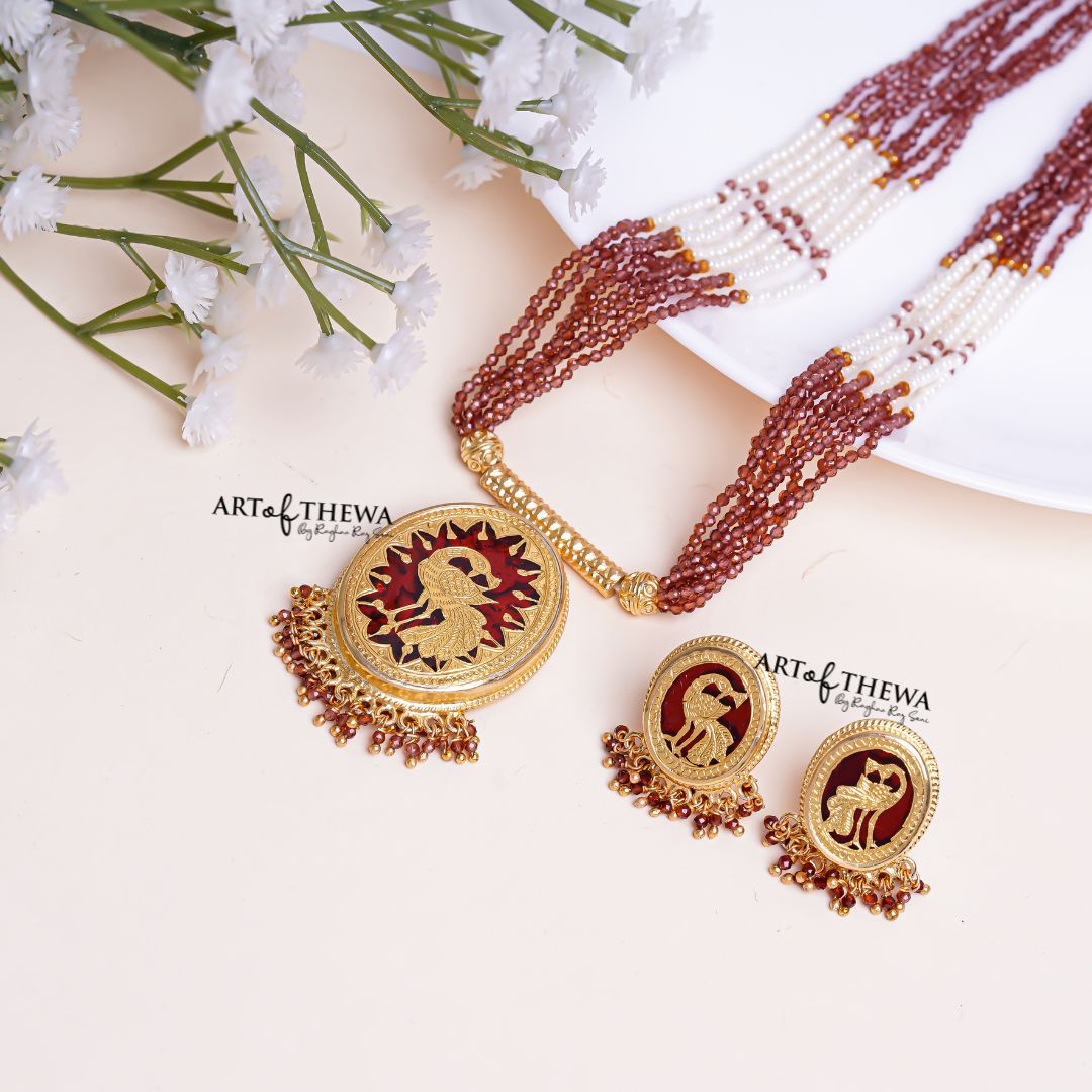 2) The ensemble is perfected with matching jhumkis, fashioned in harmony with the pendant's design. These thewa earrings mirror the pendant's elegance, imbuing your appearance with symmetry and cohesion.