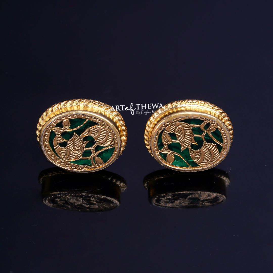 Step into the rich heritage of Rajasthan with our exquisite creation,"Oval Peacock Stud Earrings"These earrings blend the ancient art of Thewa Kala with the regal symbolism of peacocks, encapsulating the essence of Rajasthan's cultural opulence. Characteristics:-